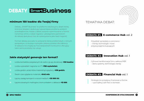 Debaty „ SMART Business” to platforma edukacyjna, dzięki której branżowi eksperci dyskutują najważniejsze problemy polskich przedsiębiorców. Każda z debat zostanie wyemitowana w formie transmisji online, a także nagrana i udostępniona partnerom do dalszej dystrybucji( np. do wykorzystania jako lead magnet).