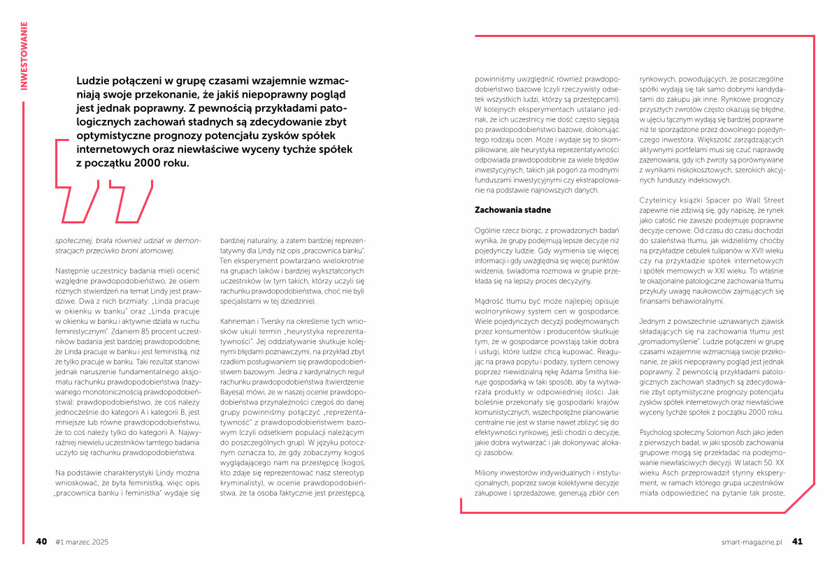 Czytelnicy książki Spacer po Wall Street zapewne nie zdziwią się, gdy napiszę, że rynek jako całość nie zawsze podejmuje poprawne decyzje cenowe. Od czasu do czasu dochodzi do szaleństwa tłumu, jak widzieliśmy choćby na przykładzie cebulek tulipanów w XVII wieku czy na przykładzie spółek internetowych i spółek memowych w XXI wieku. To właśnie te okazjonalne patologiczne zachowania tłumu przykuły uwagę naukowców zajmujących się finansami behawioralnymi.