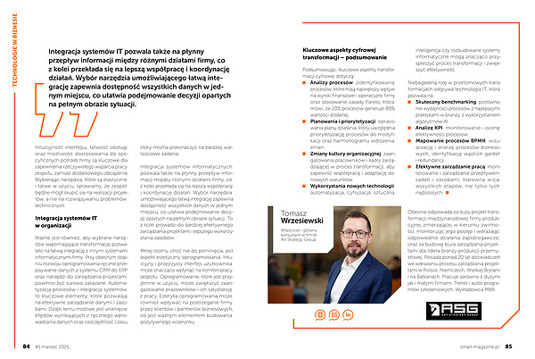 Podsumowując, kluczowe aspekty transformacji cyfrowej dotyczą: Analizy procesów: zidentyfikowania procesów, które mają największy wpływ na wyniki finansowe i operacyjne firmy oraz stosowanie zasady Pareto, która mówi, że 20 % procesów generuje 80 % wartości dodanej. Planowania i priorytetyzacji: opracowania planu działania, który uwzględnia priorytetyzację procesów do modyfikacji oraz harmonogramu wdrożenia zmian. Zmiany kultury organizacyjnej: zaangażowania pracowników i kadry zarządzającej w proces transformacji, aby zapewnić współpracę i adaptację do nowych warunków. Wykorzystania nowych technologii: automatyzacja, cyfryzacja, sztuczna inteligencja czy rozbudowane systemy informatyczne mogą znacząco przyspieszyć proces transformacji i zwiększyć efektywność.