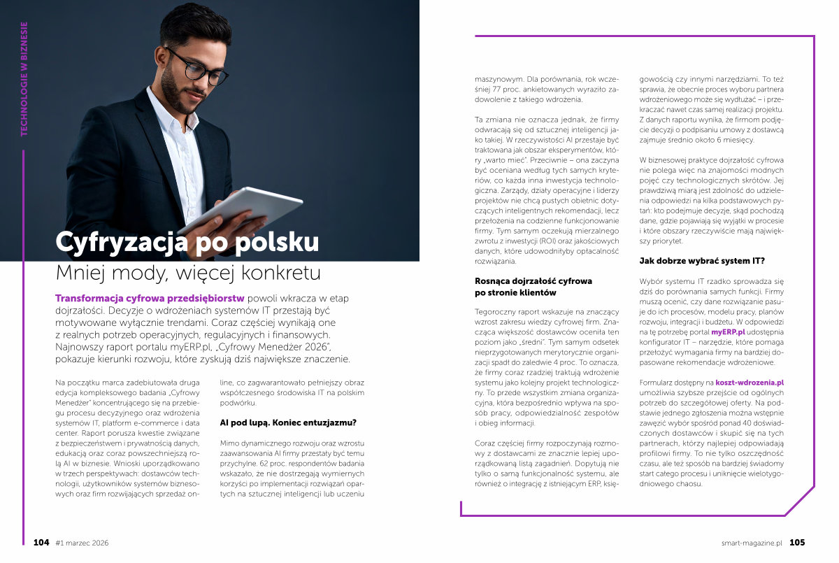 Transformacja cyfrowa przedsiębiorstw powoli wkracza w etap dojrzałości. Decyzje o wdrożeniach systemów IT przestają być motywowane wyłącznie trendami. Coraz częściej wynikają one z realnych potrzeb operacyjnych, regulacyjnych i finansowych. Najnowszy raport portalu myERP. pl, „ Cyfrowy Menedżer 2026”, pokazuje kierunki rozwoju, które zyskują dziś największe znaczenie.