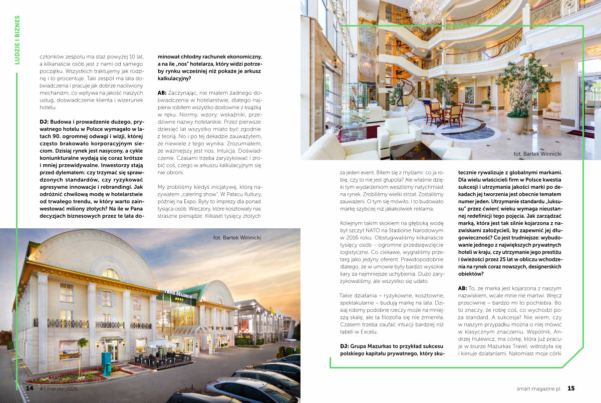 AB: Zaczynając, nie miałem żadnego doświadczenia w hotelarstwie, dlatego najpierw robiłem wszystko dosłownie z książką w ręku. Normy, wzory, wskaźniki, przedziwne nazwy hotelarskie. Przez pierwsze dziesięć lat wszystko miało być zgodnie z teorią. No i po tej dekadzie zauważyłem, że niewiele z tego wynika. Zrozumiałem, że ważniejszy jest nos. Intuicja. Doświadczenie. Czasami trzeba zaryzykować i zrobić coś, czego w arkuszu kalkulacyjnym się nie obroni.