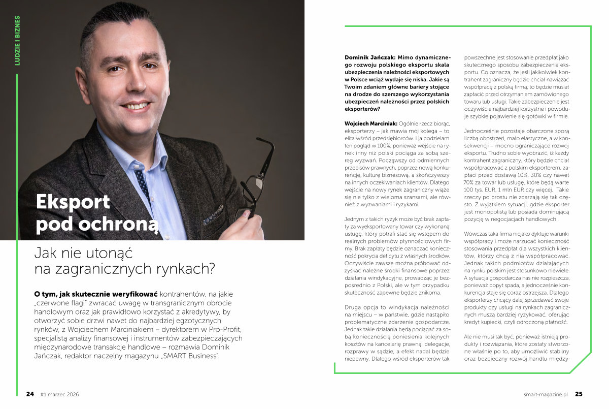 O tym, jak skutecznie weryfikować kontrahentów, na jakie „ czerwone flagi” zwracać uwagę w transgranicznym obrocie handlowym oraz jak prawidłowo korzystać z akredytywy, by otworzyć sobie drzwi nawet do najbardziej egzotycznych rynków, z Wojciechem Marciniakiem – dyrektorem w Pro-Profit, specjalistą analizy finansowej i instrumentów zabezpieczających międzynarodowe transakcje handlowe – rozmawia Dominik Jańczak, redaktor naczelny magazynu „ SMART Business”.