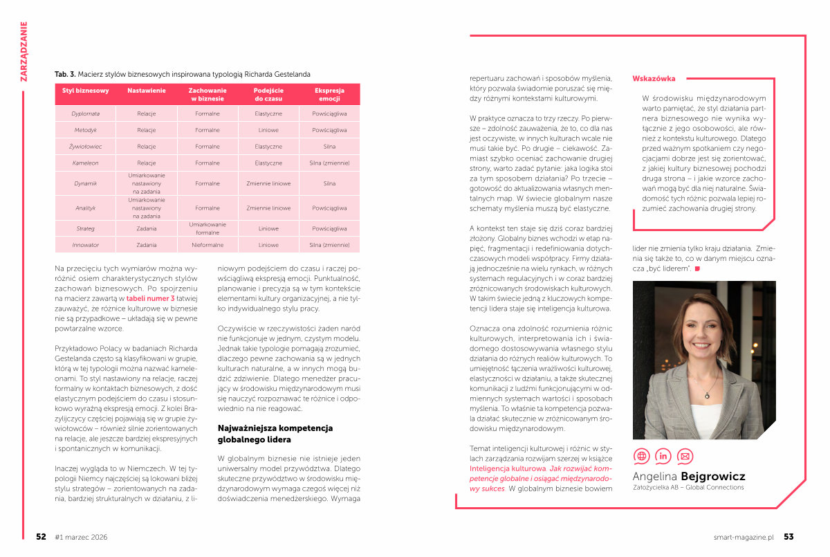 A kontekst ten staje się dziś coraz bardziej złożony. Globalny biznes wchodzi w etap napięć, fragmentacji i redefiniowania dotychczasowych modeli współpracy. Firmy działają jednocześnie na wielu rynkach, w różnych systemach regulacyjnych i w coraz bardziej zróżnicowanych środowiskach kulturowych. W takim świecie jedną z kluczowych kompetencji lidera staje się inteligencja kulturowa.