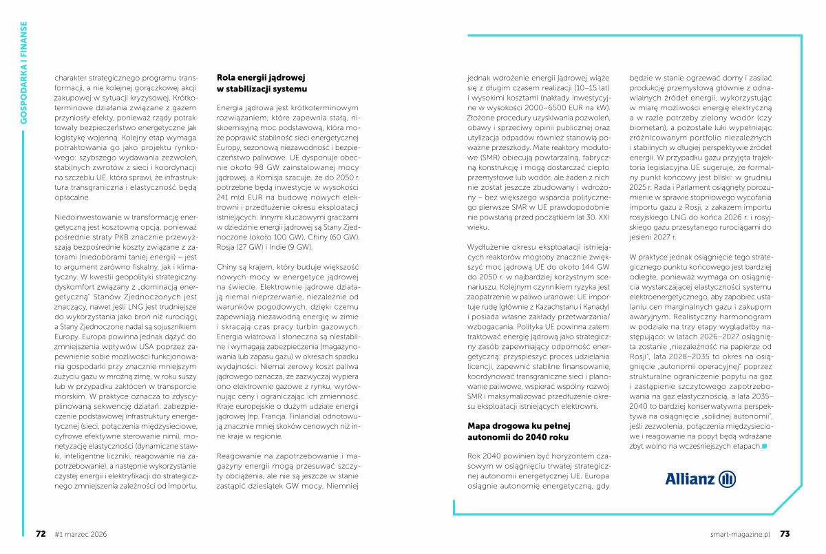 Wydłużenie okresu eksploatacji istniejących reaktorów mogłoby znacznie zwiększyć moc jądrową UE do około 144 GW do 2050 r. w najbardziej korzystnym scenariuszu. Kolejnym czynnikiem ryzyka jest zaopatrzenie w paliwo uranowe: UE importuje rudę( głównie z Kazachstanu i Kanady) i posiada własne zakłady przetwarzania / wzbogacania. Polityka UE powinna zatem traktować energię jądrową jako strategiczny zasób zapewniający odporność energetyczną: przyspieszyć proces udzielania licencji, zapewnić stabilne finansowanie, koordynować transgraniczne sieci i planowanie paliwowe, wspierać wspólny rozwój SMR i maksymalizować przedłużenie okresu eksploatacji istniejących elektrowni.
