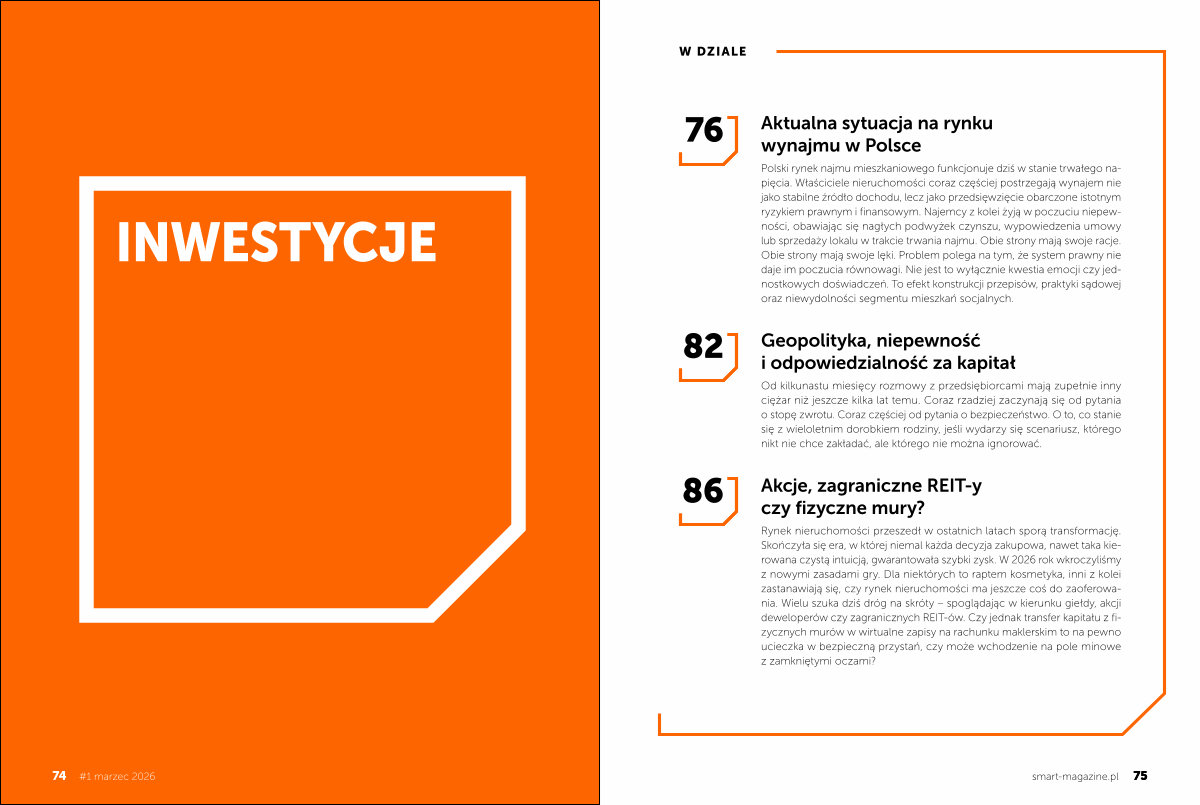 Rynek nieruchomości przeszedł w ostatnich latach sporą transformację. Skończyła się era, w której niemal każda decyzja zakupowa, nawet taka kierowana czystą intuicją, gwarantowała szybki zysk. W 2026 rok wkroczyliśmy z nowymi zasadami gry. Dla niektórych to raptem kosmetyka, inni z kolei zastanawiają się, czy rynek nieruchomości ma jeszcze coś do zaoferowania. Wielu szuka dziś dróg na skróty – spoglądając w kierunku giełdy, akcji deweloperów czy zagranicznych REIT-ów. Czy jednak transfer kapitału z fizycznych murów w wirtualne zapisy na rachunku maklerskim to na pewno ucieczka w bezpieczną przystań, czy może wchodzenie na pole minowe z zamkniętymi oczami? smart-magazine. pl 75