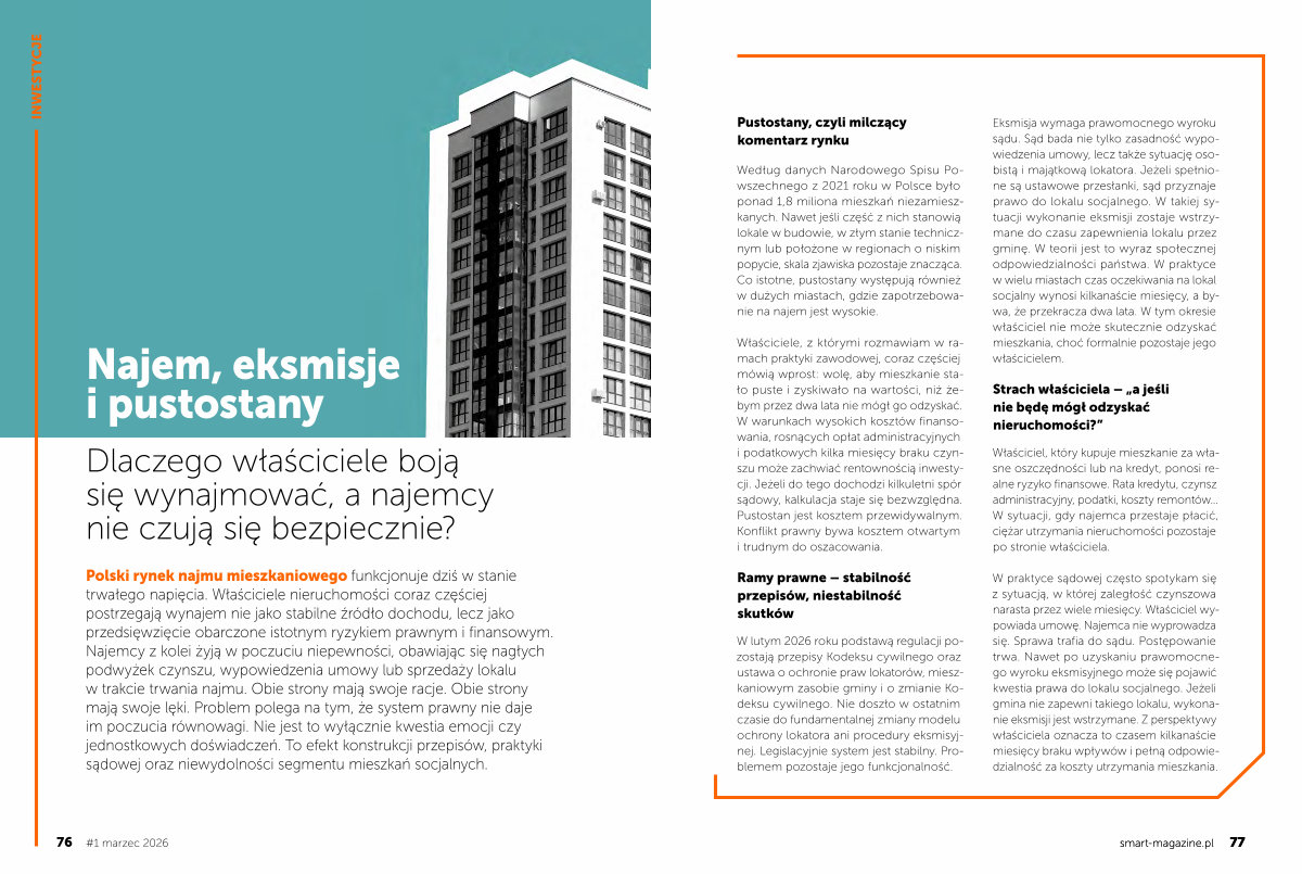 Polski rynek najmu mieszkaniowego funkcjonuje dziś w stanie trwałego napięcia. Właściciele nieruchomości coraz częściej postrzegają wynajem nie jako stabilne źródło dochodu, lecz jako przedsięwzięcie obarczone istotnym ryzykiem prawnym i finansowym. Najemcy z kolei żyją w poczuciu niepewności, obawiając się nagłych podwyżek czynszu, wypowiedzenia umowy lub sprzedaży lokalu w trakcie trwania najmu. Obie strony mają swoje racje. Obie strony mają swoje lęki. Problem polega na tym, że system prawny nie daje im poczucia równowagi. Nie jest to wyłącznie kwestia emocji czy jednostkowych doświadczeń. To efekt konstrukcji przepisów, praktyki sądowej oraz niewydolności segmentu mieszkań socjalnych.