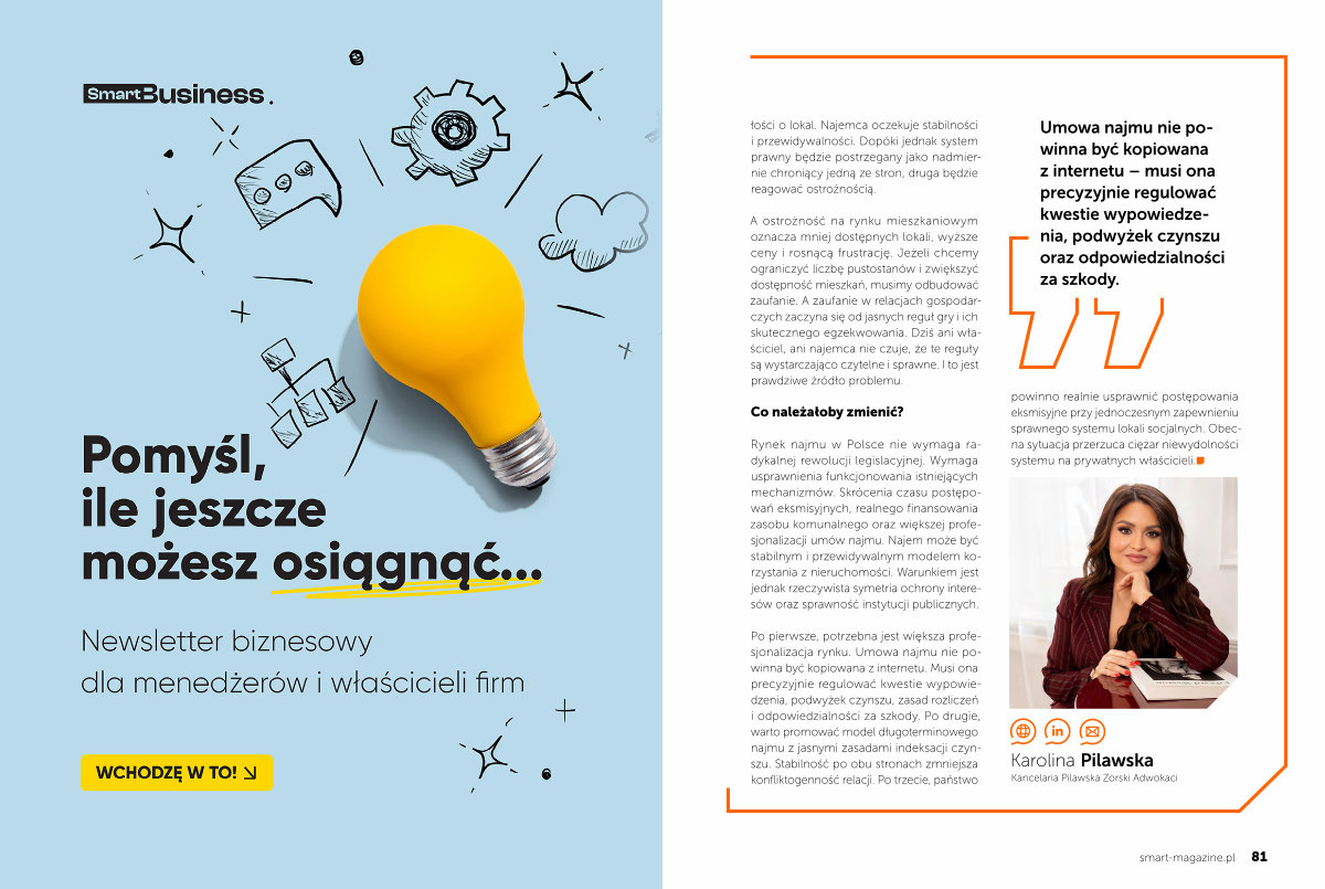 Rynek najmu w Polsce nie wymaga radykalnej rewolucji legislacyjnej. Wymaga usprawnienia funkcjonowania istniejących mechanizmów. Skrócenia czasu postępowań eksmisyjnych, realnego finansowania zasobu komunalnego oraz większej profesjonalizacji umów najmu. Najem może być stabilnym i przewidywalnym modelem korzystania z nieruchomości. Warunkiem jest jednak rzeczywista symetria ochrony interesów oraz sprawność instytucji publicznych.