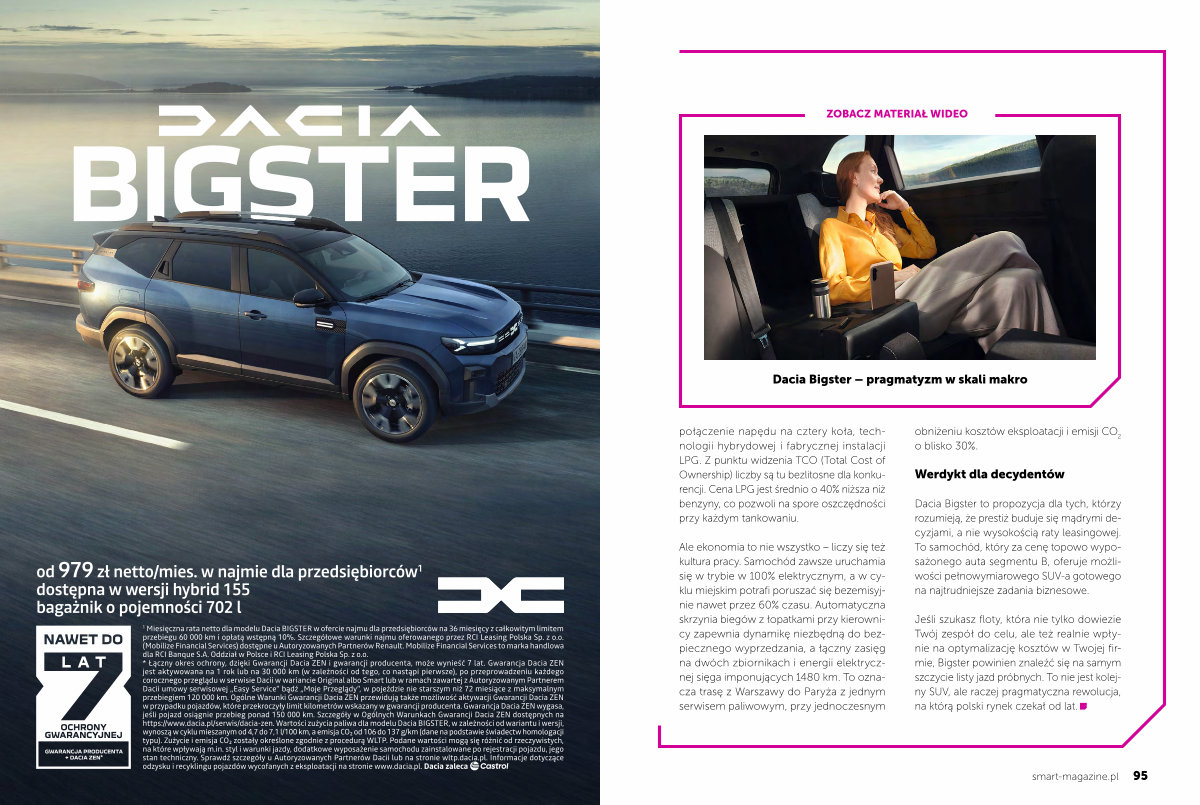 Miesięczna rata netto dla modelu Dacia BIGSTER w ofercie najmu dla przedsiębiorców na 36 miesięcy z całkowitym limitem przebiegu 60 000 km i opłatą wstępną 10 %. Szczegółowe warunki najmu oferowanego przez RCI Leasing Polska Sp. z o. o.( Mobilize Financial Services) dostępne u Autoryzowanych Partnerów Renault. Mobilize Financial Services to marka handlowa dla RCI Banque S. A. Oddział w Polsce i RCI Leasing Polska Sp. z o. o. * Łączny okres ochrony, dzięki Gwarancji Dacia ZEN i gwarancji producenta, może wynieść 7 lat. Gwarancja Dacia ZEN jest aktywowana na 1 rok lub na 30 000 km( w zależności od tego, co nastąpi pierwsze), po przeprowadzeniu każdego corocznego przeglądu w serwisie Dacii w wariancie Original albo Smart lub w ramach zawartej z Autoryzowanym Partnerem Dacii umowy serwisowej „ Easy Service” bądź „ Moje Przeglądy”, w pojeździe nie starszym niż 72 miesiące z maksymalnym przebiegiem 120 000 km. Ogólne Warunki Gwarancji Dacia ZEN przewidują także możliwość aktywacji Gwarancji Dacia ZEN w przypadku pojazdów, które przekroczyły limit kilometrów wskazany w gwarancji producenta. Gwarancja Dacia ZEN wygasa, jeśli pojazd osiągnie przebieg ponad 150 000 km. Szczegóły w Ogólnych Warunkach Gwarancji Dacia ZEN dostępnych na https:// www. dacia. pl / serwis / dacia-zen. Wartości zużycia paliwa dla modelu Dacia BIGSTER, w zależności od wariantu i wersji, wynoszą w cyklu mieszanym od 4,7 do 7,1 l / 100 km, a emisja CO₂ od 106 do 137 g / km( dane na podstawie świadectw homologacji typu). Zużycie i emisja CO₂ zostały określone zgodnie z procedurą WLTP. Podane wartości mogą się różnić od rzeczywistych, na które wpływają m. in. styl i warunki jazdy, dodatkowe wyposażenie samochodu zainstalowane po rejestracji pojazdu, jego stan techniczny. Sprawdź szczegóły u Autoryzowanych Partnerów Dacii lub na stronie wltp. dacia. pl. Informacje dotyczące odzysku i recyklingu pojazdów wycofanych z eksploatacji na stronie www. dacia. pl. Dacia zaleca