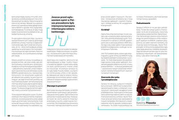 Sprawa C-471 / 24 to nie jest spór jednostkowy. To test dla całego systemu finansowego: na ile jest on przejrzysty, zrozumiały i sprawiedliwy wobec klientów. Opinia Rzecznika Generalnego otwiera konsumentom drogę do kwestionowania umów kredytowych opartych na WIBOR, a bankom przypomina, że żaden element kontraktu nie może być poza kontrolą sądu. Wyrok TSUE przesądzi, w którą stronę pójdą polskie sądy i jakie będą dalsze losy kredytów złotowych. Jego konsekwencje odczują nie tylko kredytobiorcy indywidualni, ale także przedsiębiorcy i cały sektor finansowy.
