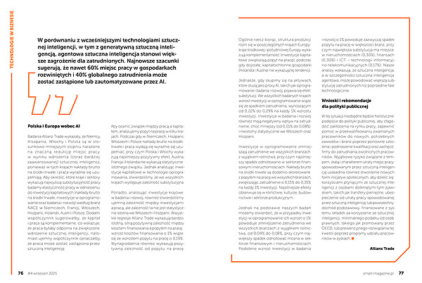 Badania Allianz Trade wykazały, że Niemcy, Hiszpania, Włochy i Polska są w stosunkowo mniejszym stopniu narażone na znaczną redukcję miejsc pracy w wyniku wdrożenia( coraz bardziej zaawansowanej) sztucznej inteligencji, ponieważ w tych krajach nakłady brutto na środki trwałe i praca wyraźnie się uzupełniają. Aby określić, które kraje i sektory wykazują najwyższą substytucyjność pracy, badamy elastyczność pracy w odniesieniu do inwestycji kapitałowych( nakłady brutto na środki trwałe, inwestycje w oprogramowanie oraz badania i rozwój) według branż NACE w Niemczech, Francji, Włoszech, Hiszpanii, Holandii, Austrii i Polsce. Dodatni współczynnik sugerowałby, że kapitał i praca są komplementarne, co wskazuje, że praca byłaby odporna na zwiększone wdrożenie sztucznej inteligencji, natomiast ujemny współczynnik oznaczałby, że praca może zostać zastąpiona przez sztuczną inteligencję.