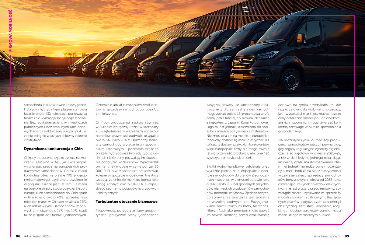 FIRMOWA MOBILNOŚĆ samochodu jest kosztowne i niewygodne. Hybrydy i hybrydy typu plug-in stanowią łącznie około 43 % rejestracji, ponieważ są tańsze i nie wymagają specjalnego ładowania. Bez radykalnej zmiany w inwestycjach publicznych i bez stabilnych ram cenowych energii elektrycznej Europa ryzykuje, że nie osiągnie własnych celów w zakresie elektryfikacji.