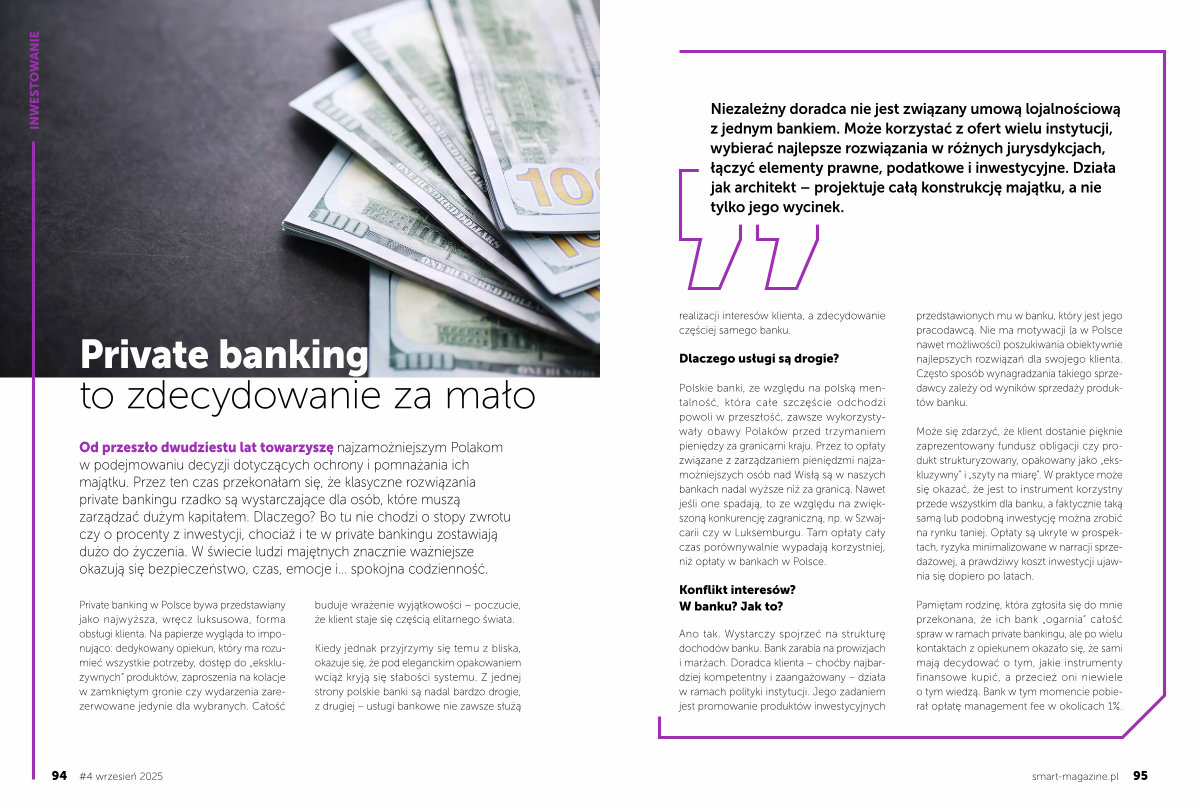 Private banking w Polsce bywa przedstawiany jako najwyższa, wręcz luksusowa, forma obsługi klienta. Na papierze wygląda to imponująco: dedykowany opiekun, który ma rozumieć wszystkie potrzeby, dostęp do „ ekskluzywnych” produktów, zaproszenia na kolacje w zamkniętym gronie czy wydarzenia zarezerwowane jedynie dla wybranych. Całość buduje wrażenie wyjątkowości – poczucie, że klient staje się częścią elitarnego świata.