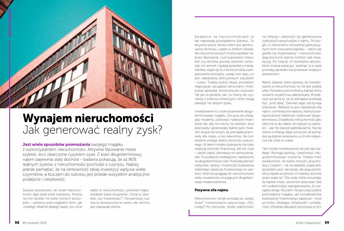 Jest wiele sposobów pomnażania swojego majątku z wykorzystaniem nieruchomości. Aktywne flipowanie niesie szybkie, lecz obarczone ryzykiem zyski. Z kolei długoterminowy najem zapewnia stały dochód – badania pokazują, że aż 80 % realnych zysków z nieruchomości pochodzi z czynszu. Należy jednak pamiętać, że na rentowność takiej inwestycji wpływa wiele czynników, a kluczem do sukcesu jest przede wszystkim analityczne podejście i cierpliwość.
