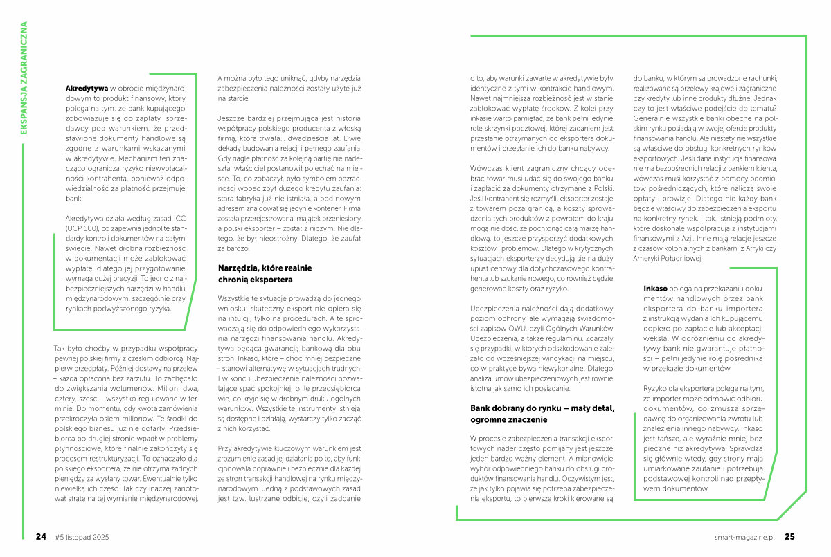 Ryzyko dla eksportera polega na tym, że importer może odmówić odbioru dokumentów, co zmusza sprzedawcę do organizowania zwrotu lub znalezienia innego nabywcy. Inkaso jest tańsze, ale wyraźnie mniej bezpieczne niż akredytywa. Sprawdza się głównie wtedy, gdy strony mają umiarkowane zaufanie i potrzebują podstawowej kontroli nad przepływem dokumentów. smart-magazine. pl