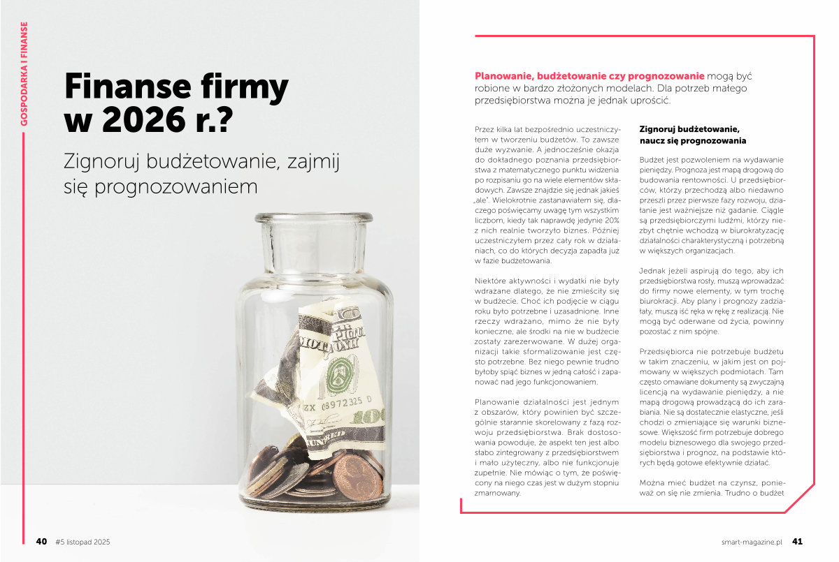 Przedsiębiorca nie potrzebuje budżetu w takim znaczeniu, w jakim jest on pojmowany w większych podmiotach. Tam często omawiane dokumenty są zwyczajną licencją na wydawanie pieniędzy, a nie mapą drogową prowadzącą do ich zarabiania. Nie są dostatecznie elastyczne, jeśli chodzi o zmieniające się warunki biznesowe. Większość firm potrzebuje dobrego modelu biznesowego dla swojego przedsiębiorstwa i prognoz, na podstawie których będą gotowe efektywnie działać.