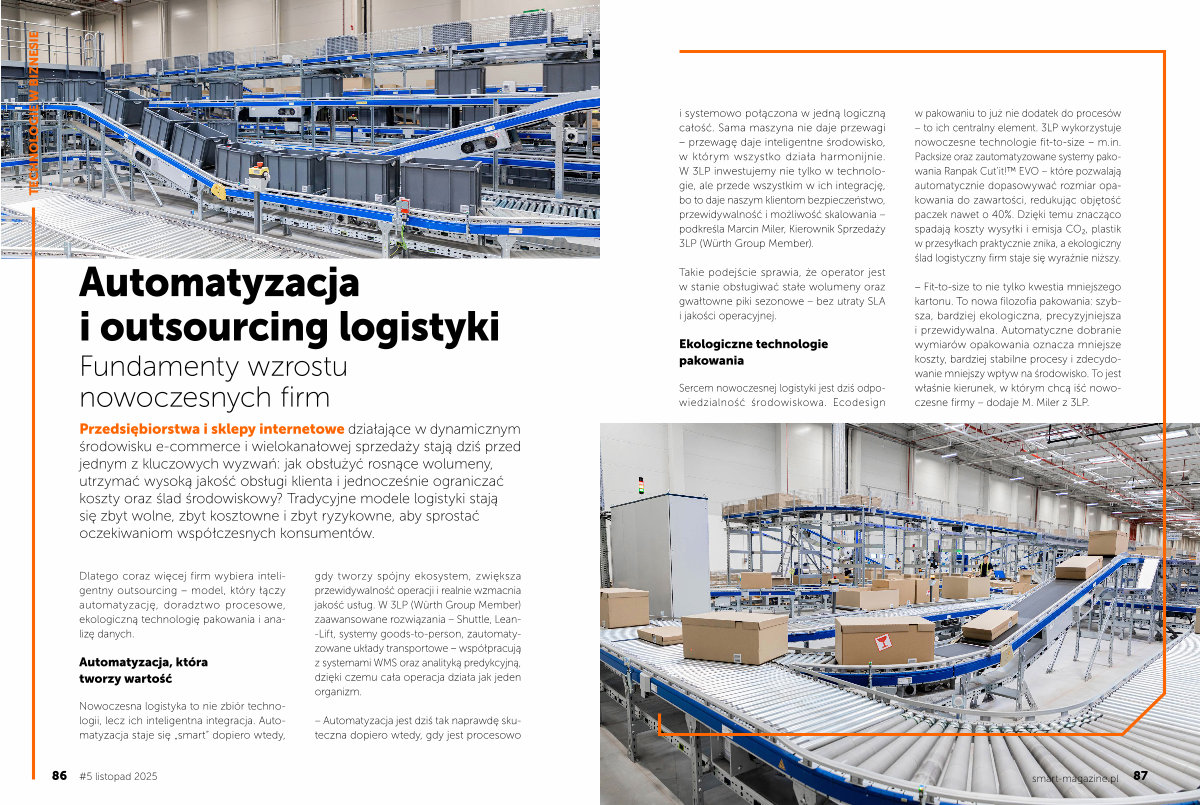 Nowoczesna logistyka to nie zbiór technologii, lecz ich inteligentna integracja. Automatyzacja staje się „ smart” dopiero wtedy, gdy tworzy spójny ekosystem, zwiększa przewidywalność operacji i realnie wzmacnia jakość usług. W 3LP( Würth Group Member) zaawansowane rozwiązania – Shuttle, Lean--Lift, systemy goods-to-person, zautomatyzowane układy transportowe – współpracują z systemami WMS oraz analityką predykcyjną, dzięki czemu cała operacja działa jak jeden organizm.